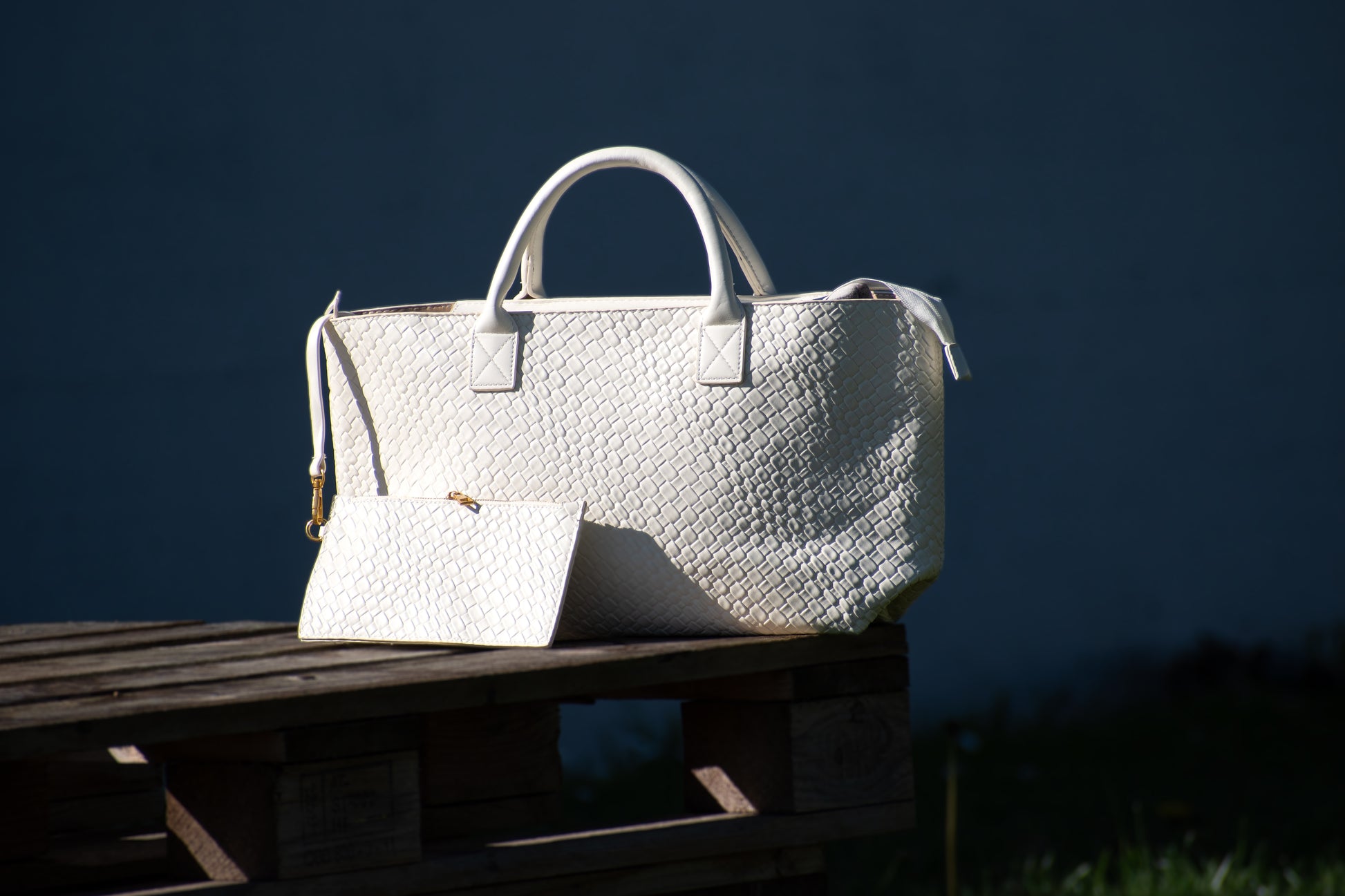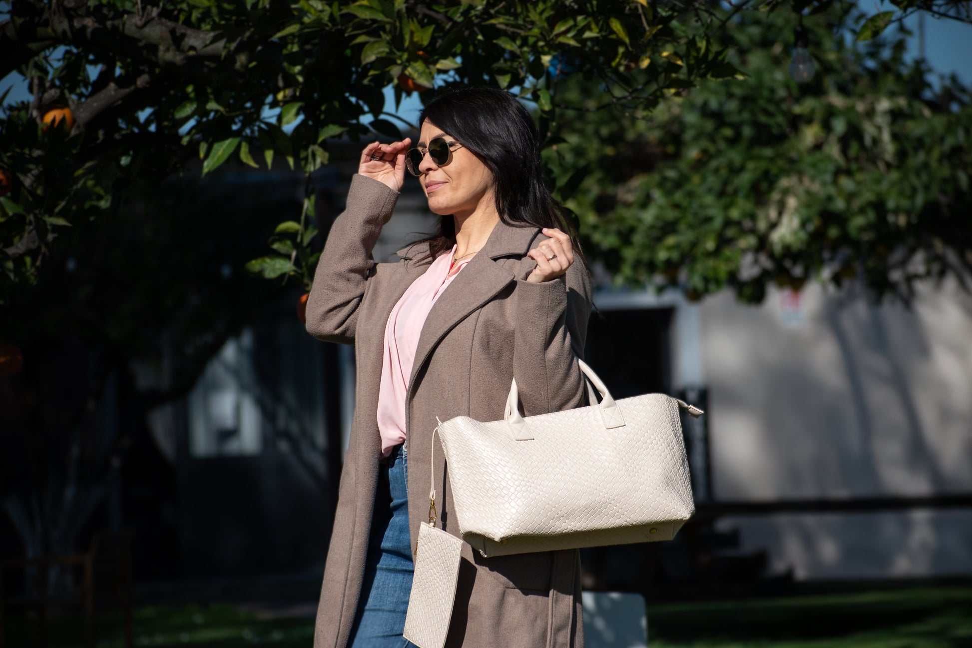 Trama in rilievo, tracolla removibile e regolabile, borsello abbinato con chiusura a zip e tacchetti di appoggio alla base.
