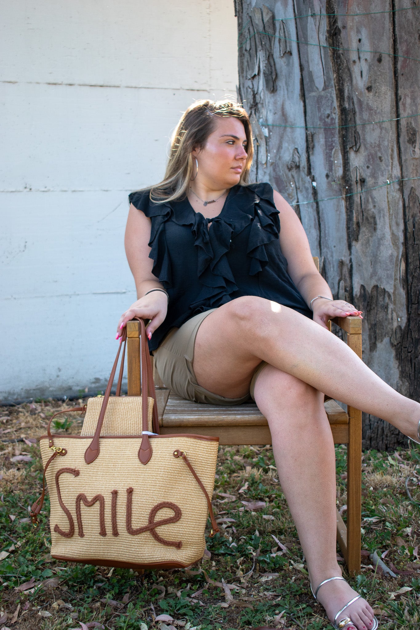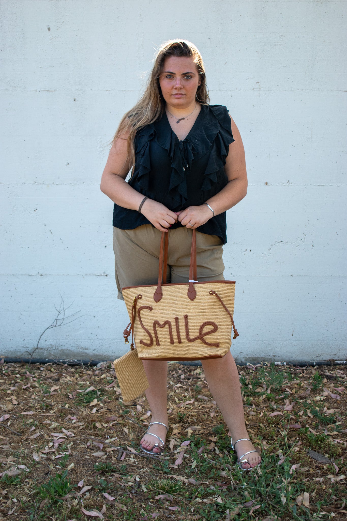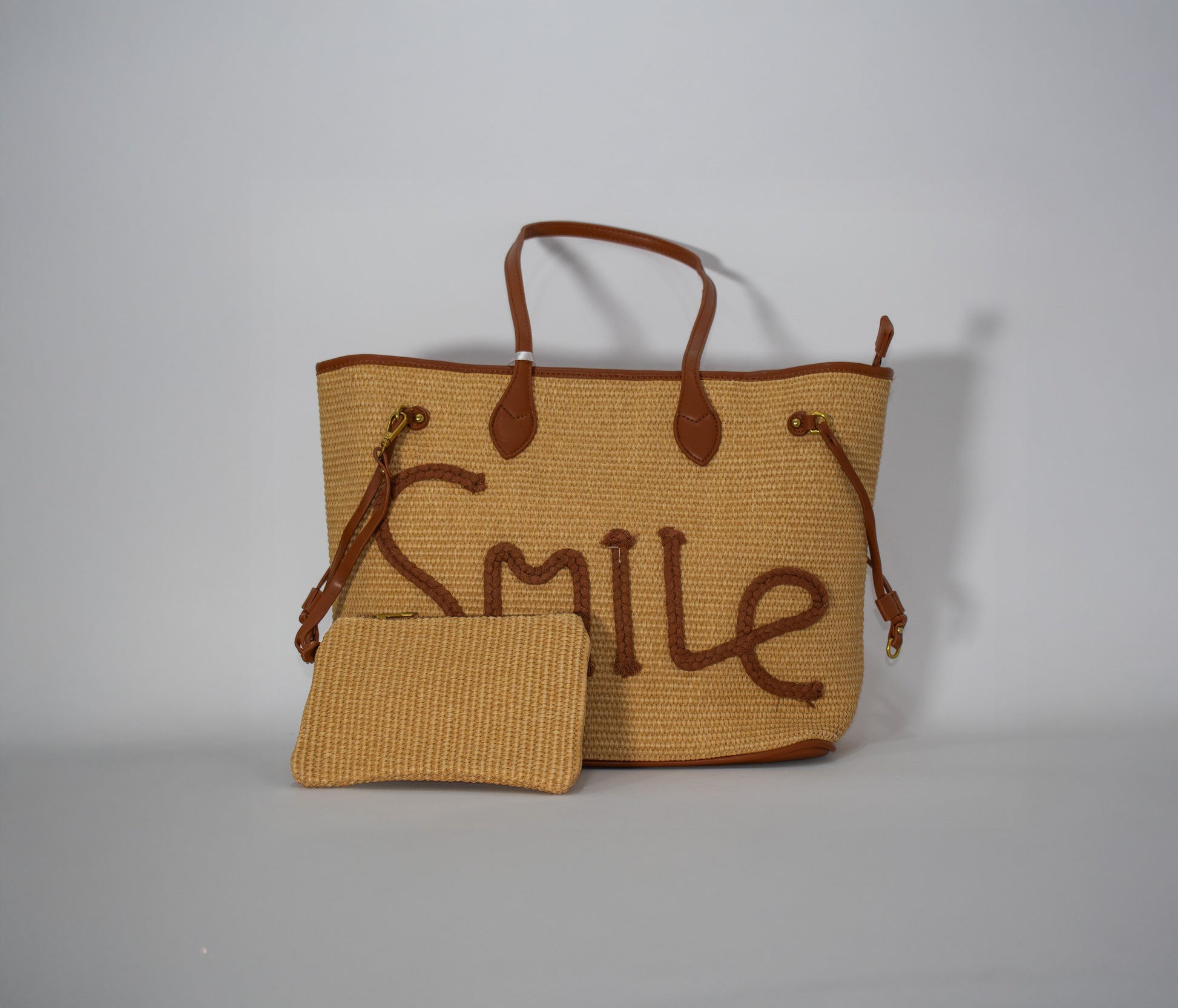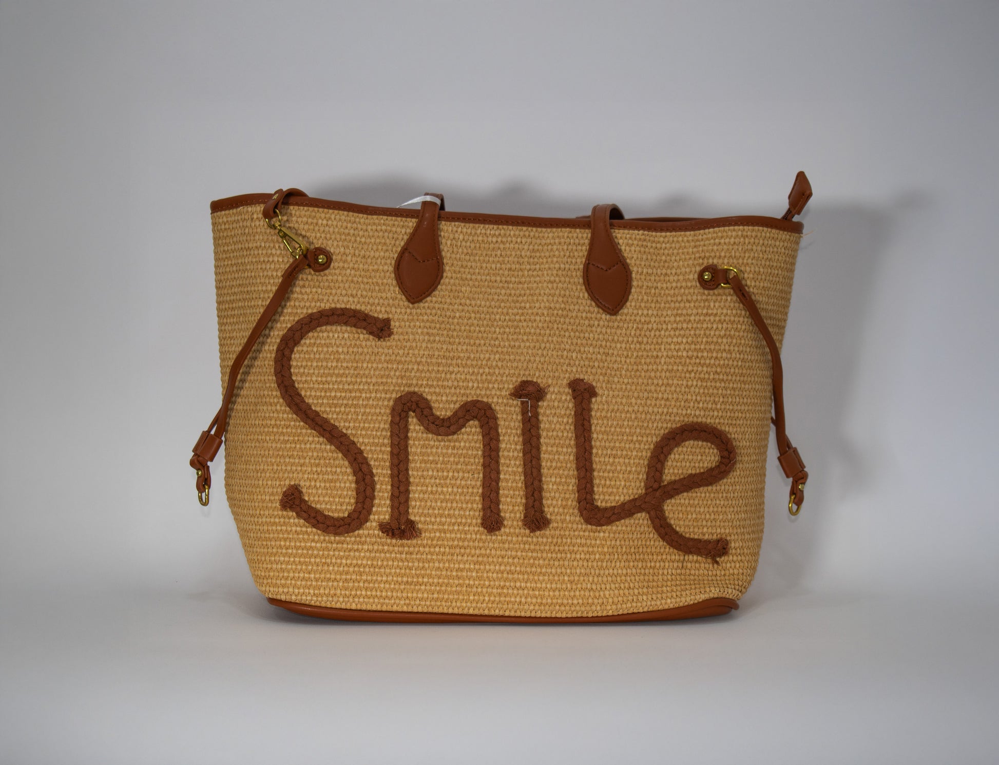Manici e scritta sul fronte 'Smile" in ecopelle marrone.