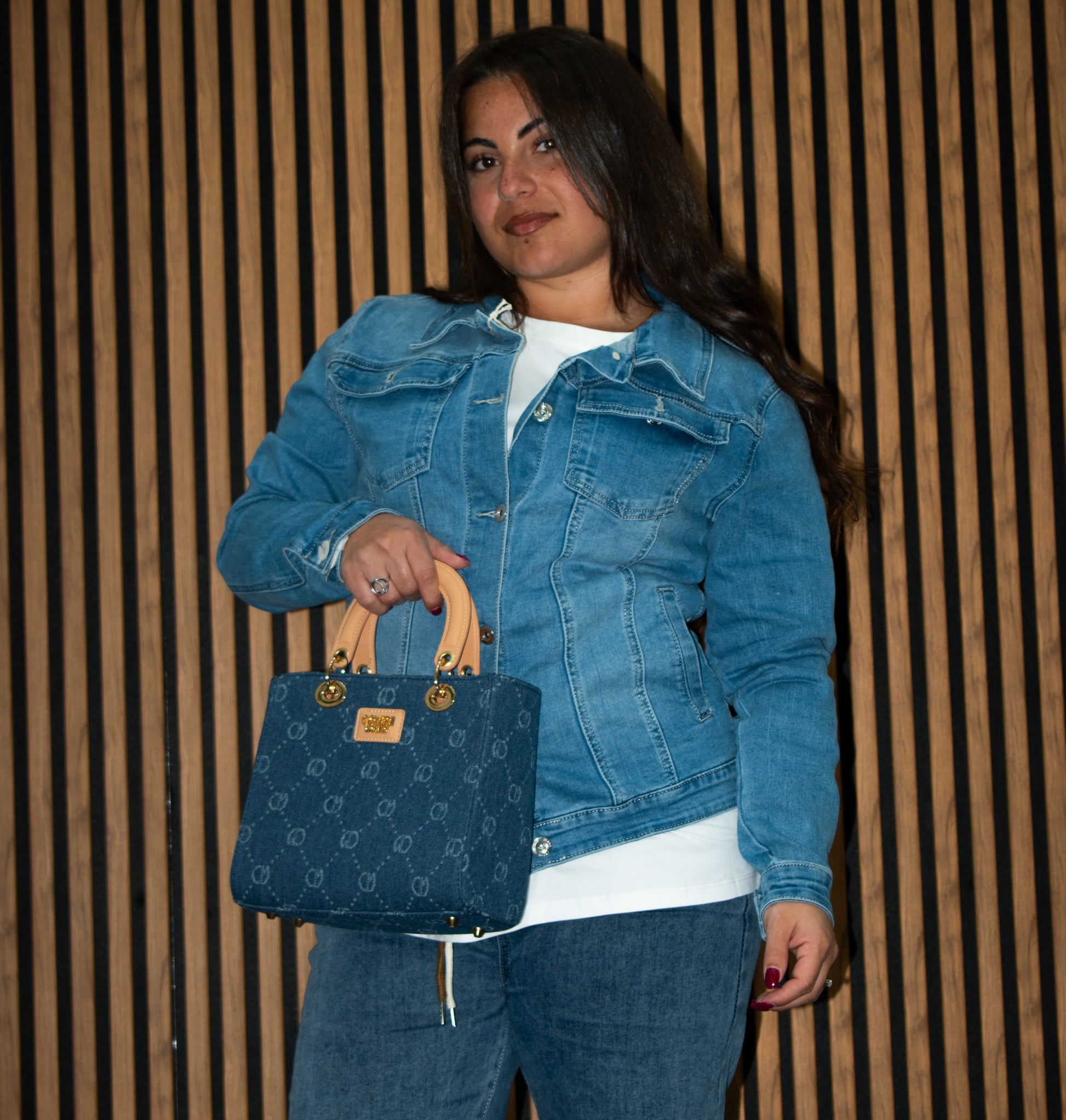 Borsetta jeans piccola con manico rigido e tracolla removibile.