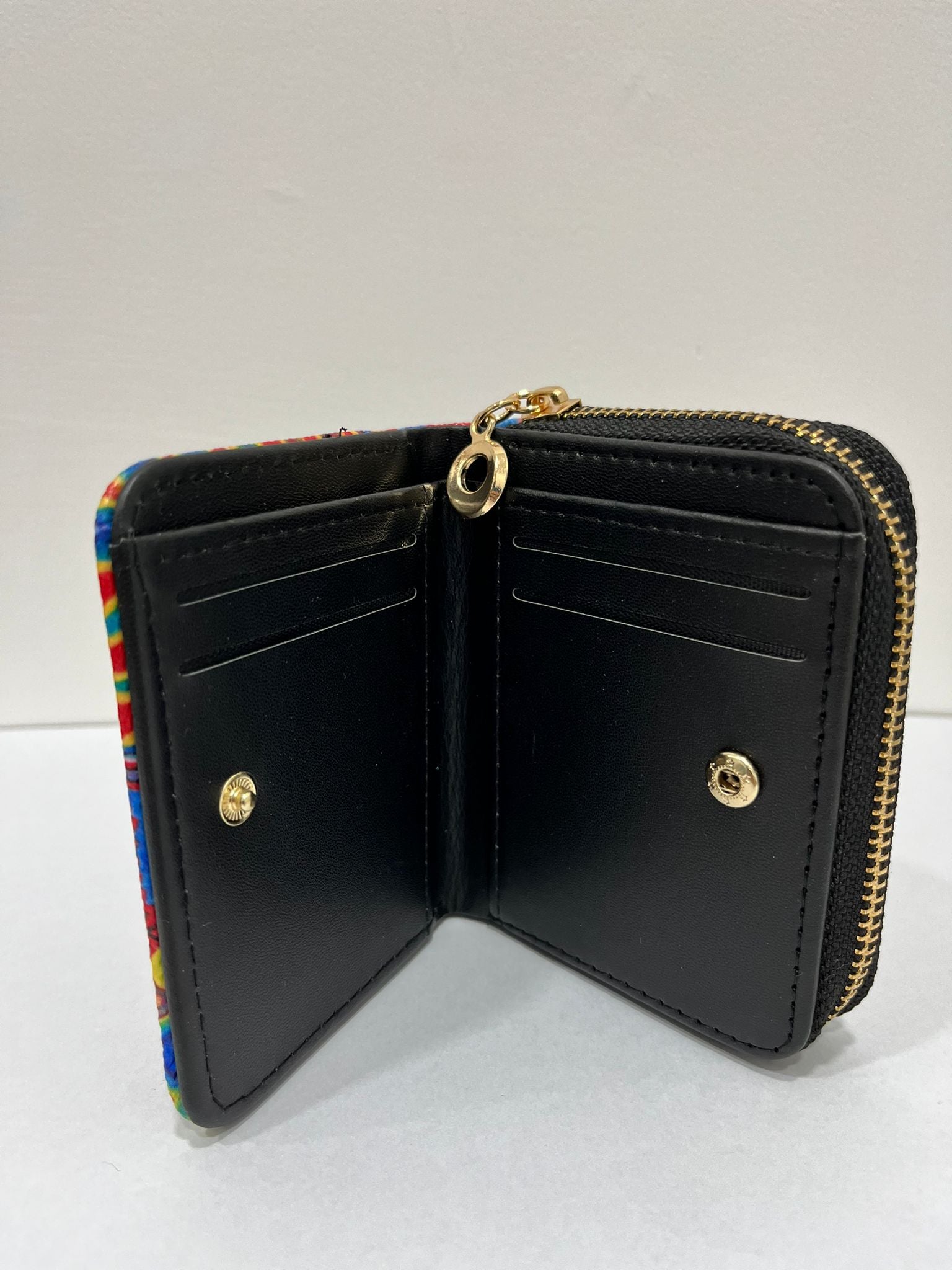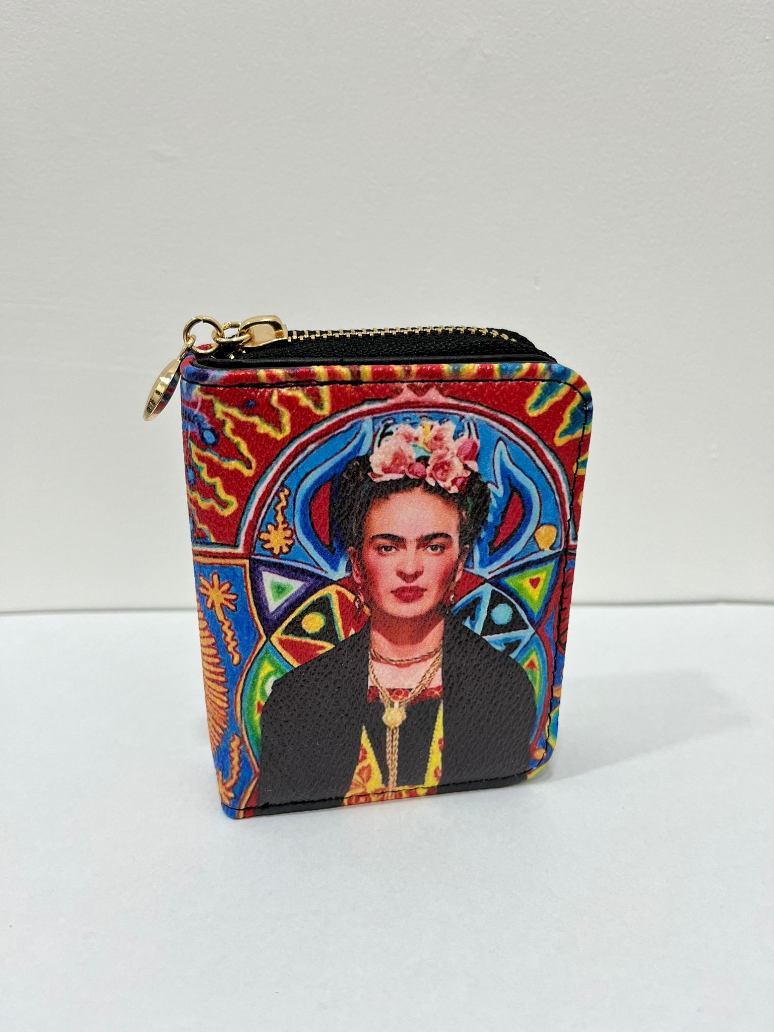 Portafoglio in ecopelle con stampa Frida Kahlo. Chiusura con cerniera robusta e multitasche con portacarte.