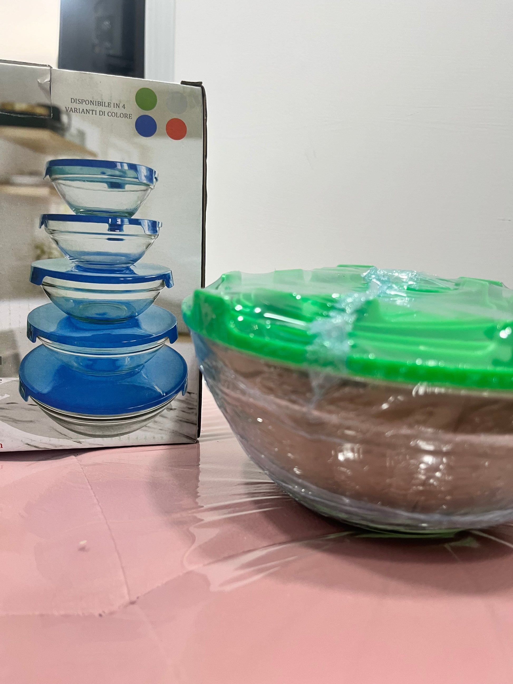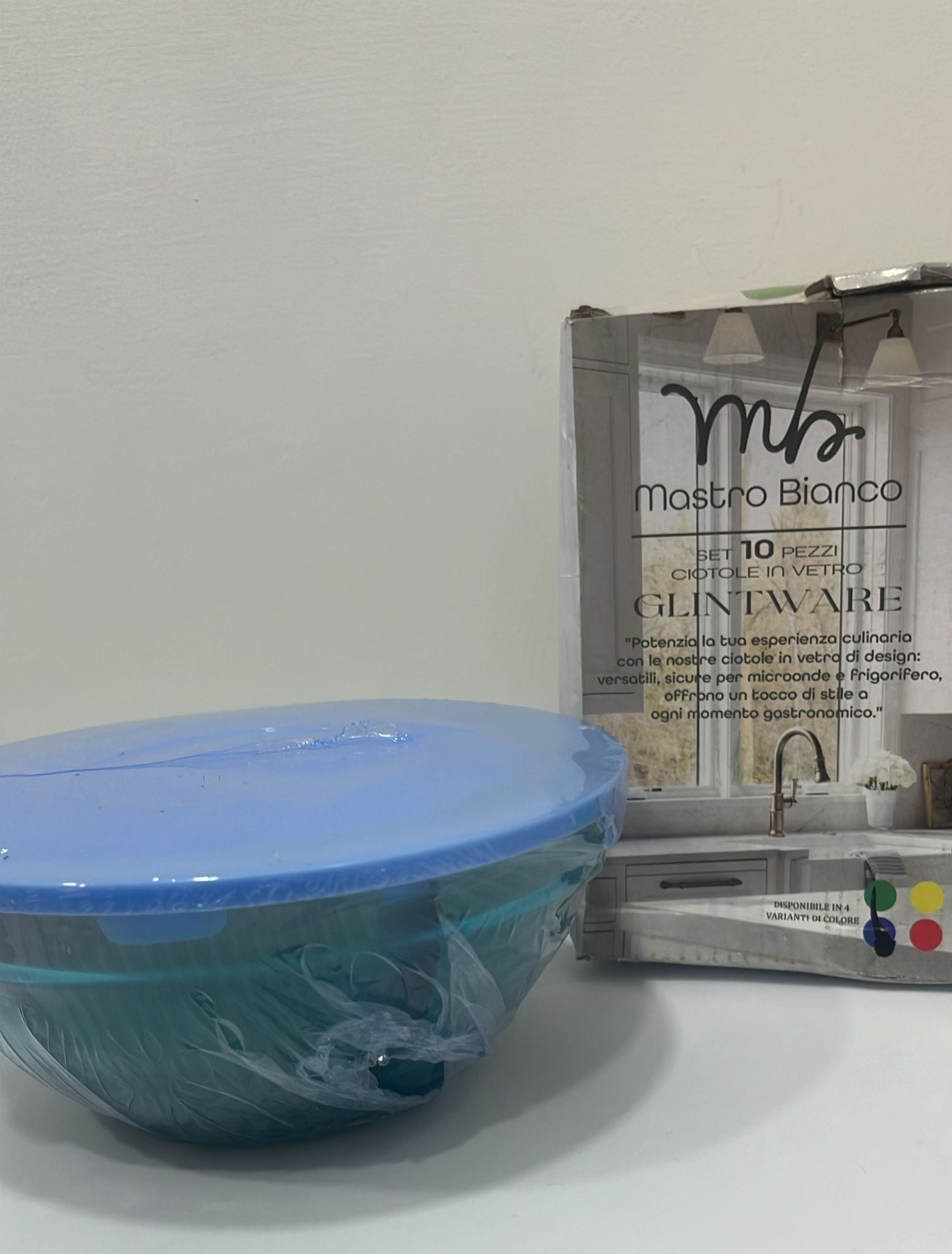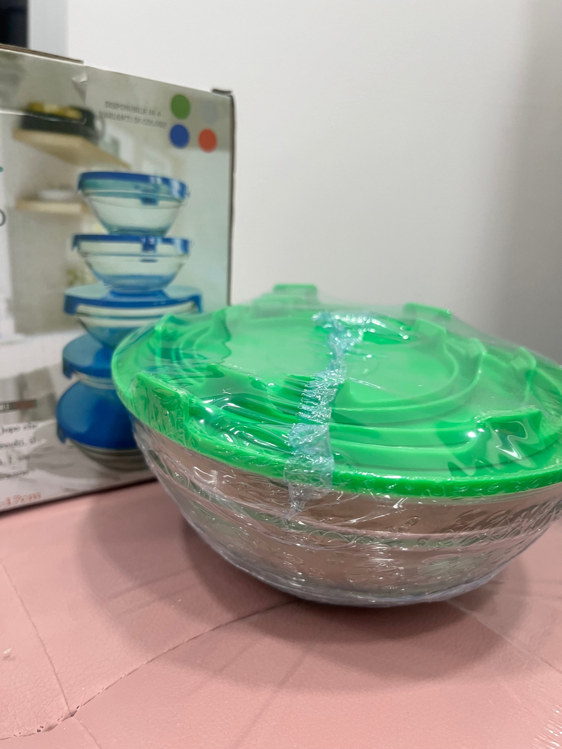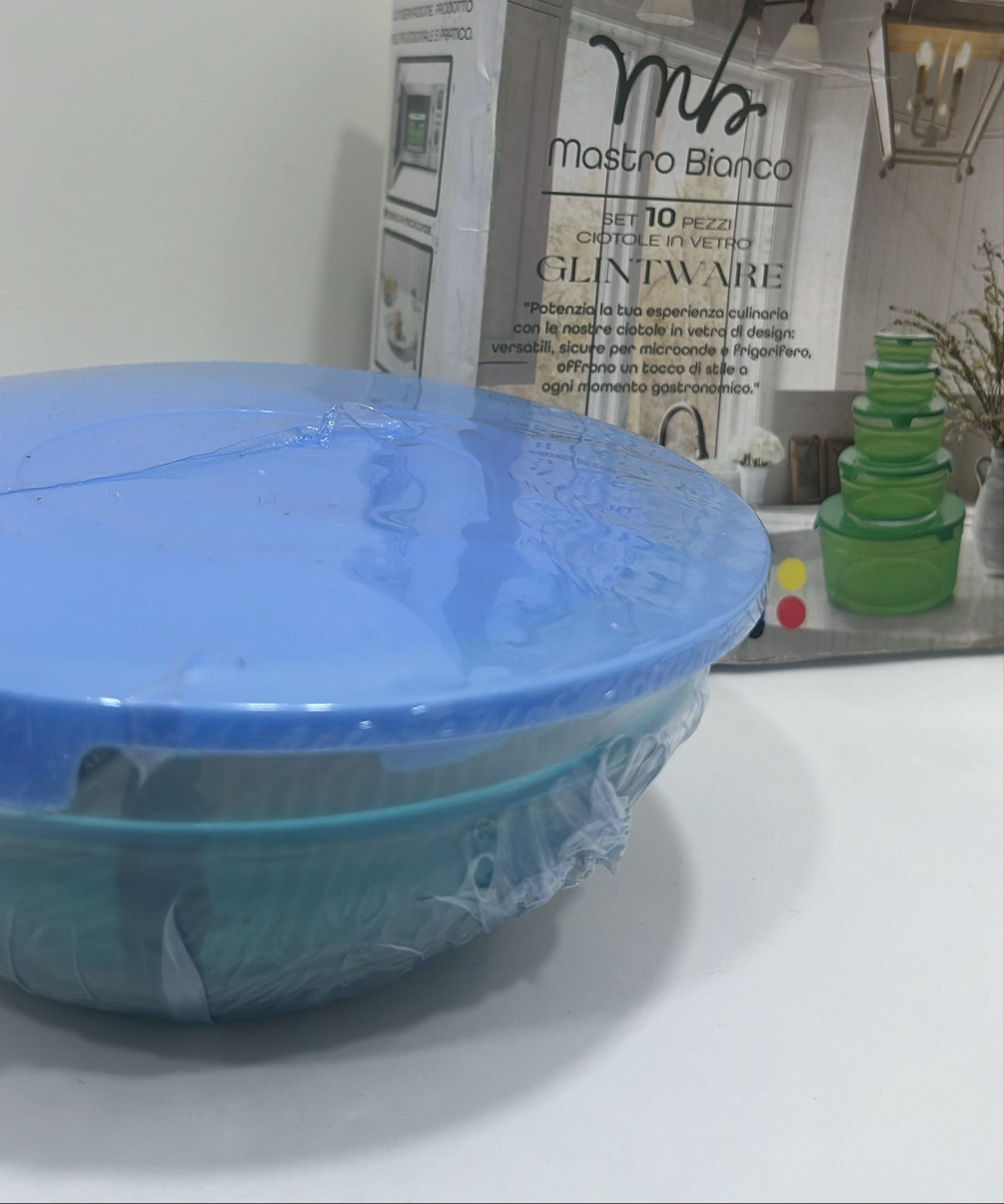 Set di 5 ciotole in vetro e 5 coperchi in silicone per assicurare una chiusura ermetica del contenitore. Disponibili nel colore verde o blu